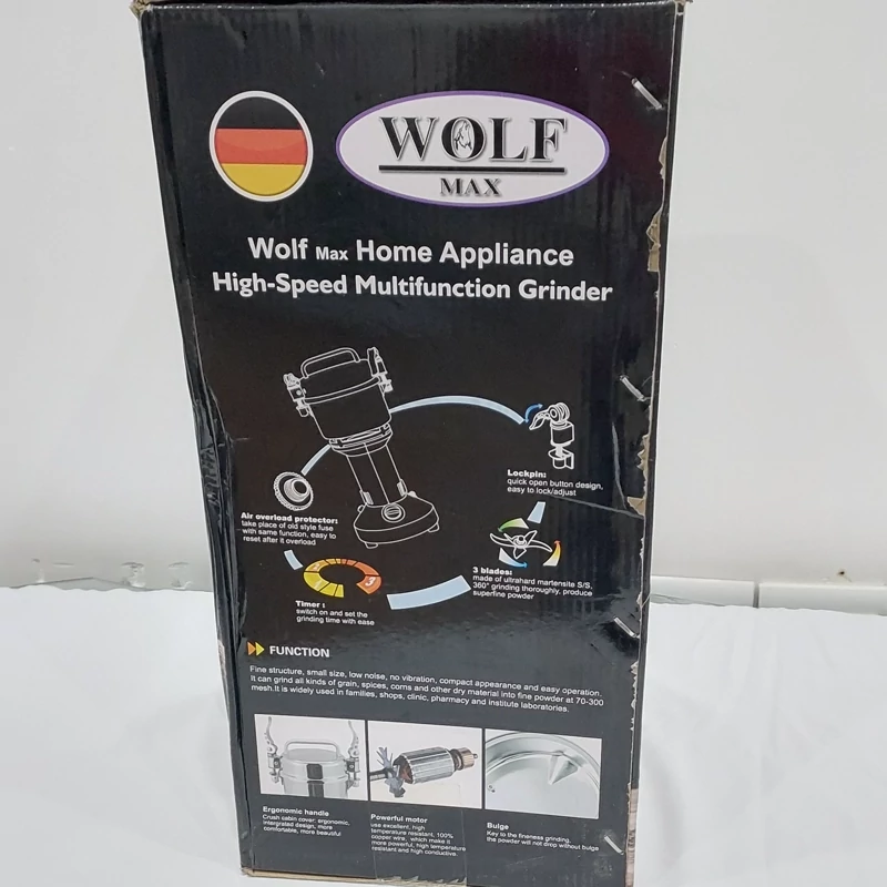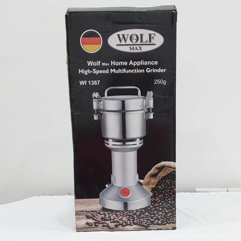 آسیاب حرفه ای ولف مدل 1367، 250 گرمی مناسب برای مصارف خانگی و صنعتی و آسیاب کردن انواع مواد و دانه های سخت و نرم از جمله : زردچوبه، هلیله، هسته خرما و هسته سنجد و… . بدنه این دستگاه از استیل ضد زنگ می باشد. موتور این دستگاه 1200 وات قدرت دارد؛ که نشان دهنده ی قدرت بالای دستگاه می باشد و در سر راه موتور یک فیوز حرارتی قرار دارد که در صورت بالا و یا پایین رفتن ولتاژ برق از آسیب رسیدن به موتور دستگاه جلوگیری می کند. تیغه های این دستگاه به صورت ترکیبی از سه نوع تیغ کوتاه و بلند ساخته شده که باعث میشود مواد به صورت یکنواخت آسیاب شود و از هدر رفتن مواد جلوگیری میشود. اقلام همراه این دستگاه شامل: دو دست تیغ کامل یدک،فرچه جهت تمیز کردن آسیاب و ذغال یدک می باشد.